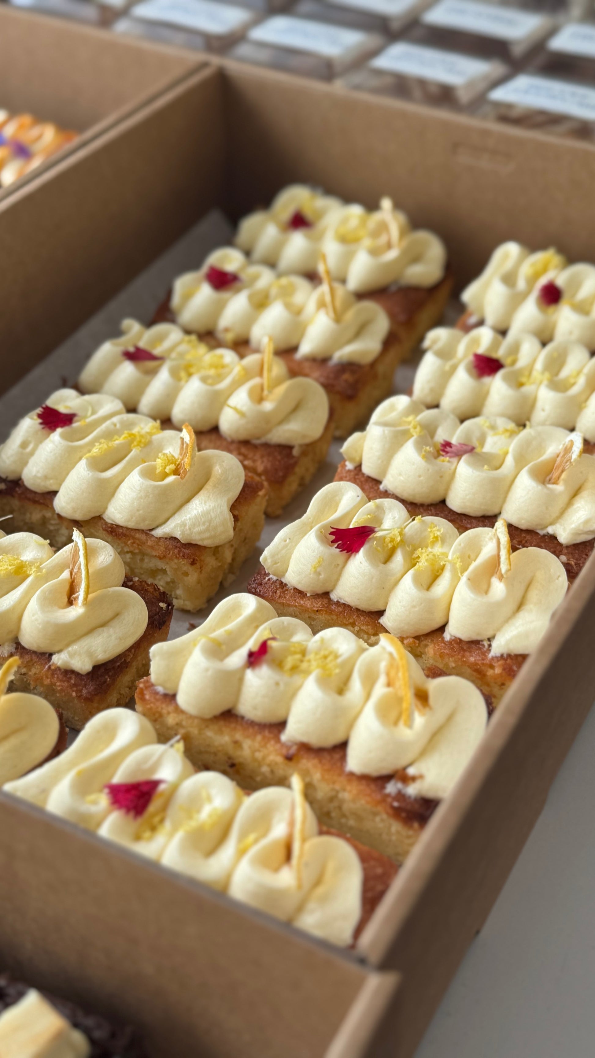 Our mini cakes are the prettiest little treats for V Day. Choose between Lemon Syrup or Sticky Date mini cakes. Iced & decorated with pink & red sprinkles & edible flowers and each pack contains 6 mini cakes.